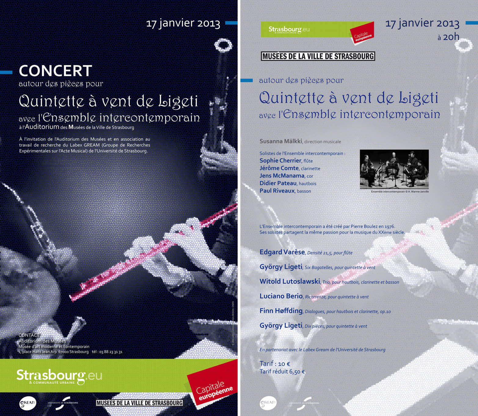 Programme - Edgard Varèse, Densité 21,5, pour flûte ; György Ligeti, Six Bagatelles, pour quintette à vent ; Witold Lutoslawski, Trio, pour hautbois, clarinette et basson ; Luciano Berio, Ricorrenze, pour quintette à vent ; Finn Høffding, Dialogues, pour hautbois et clarinette, op.10 ; György Ligeti, Dix pièces, pour quintette à vent.